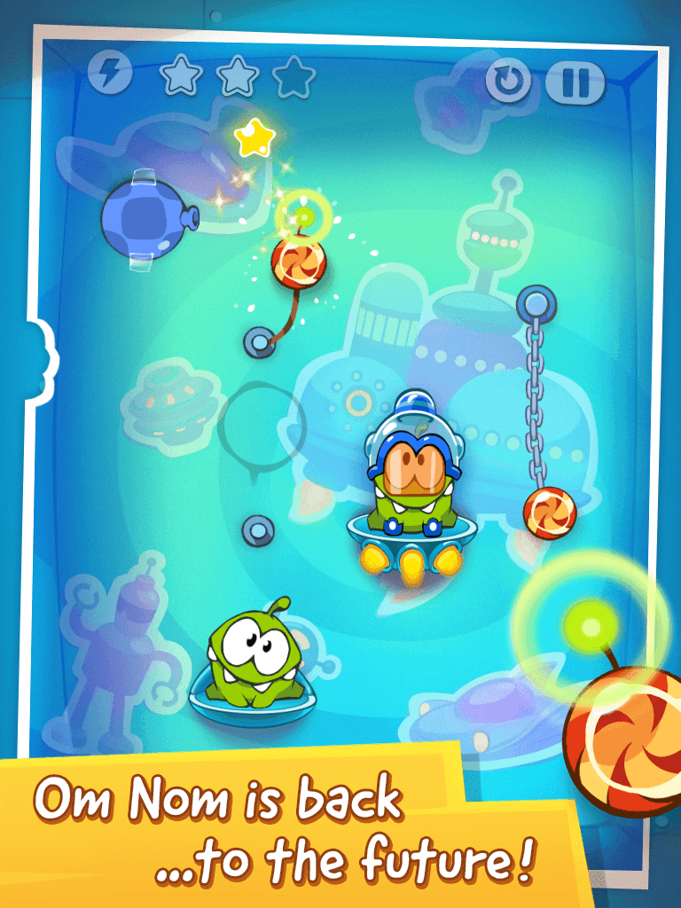Join Om Nom as he travels back in time to feed his ancestors with candy. Cut the Rope: Time Travel is a whirlwind adventure filled with time-traveling, candy-crunching, physics-based action!